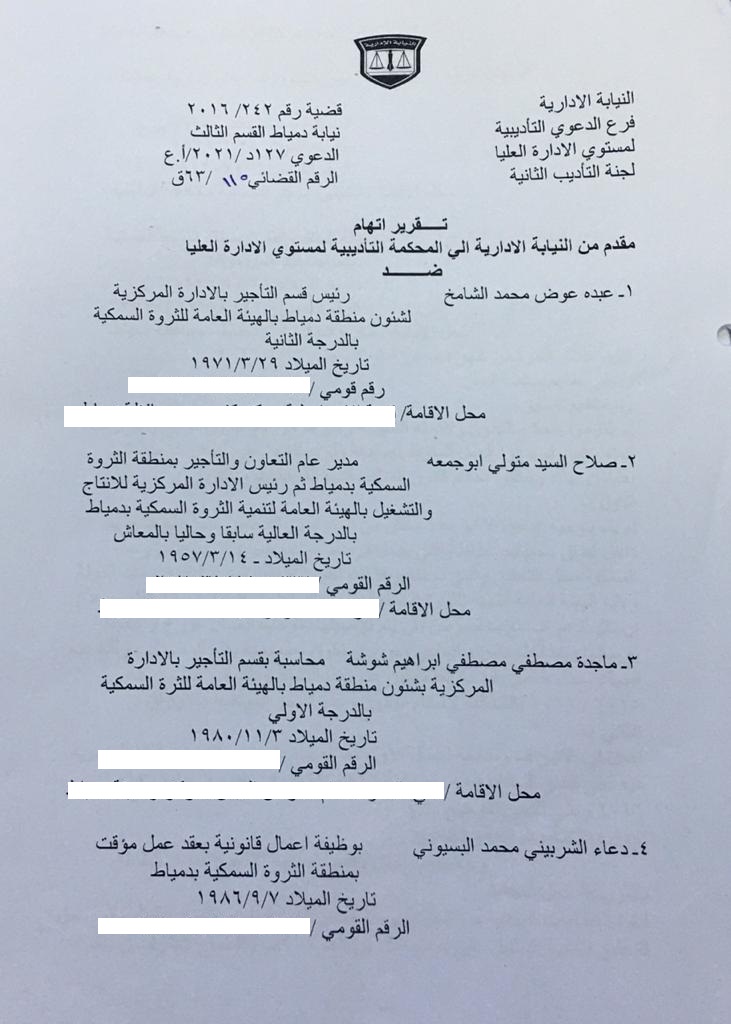 وتضم قائمة المحالين كلًا من عبده عوض محمد، رئيس قسم التأجير بالإدارة المركزية لشئون منطقة دمياط بالهيئة العامة للثروة السمكية وصلاح السيد متولي، رئيس الإدارة المركزية للإنتاج والتشغيل بالهيئة وماجدة مصطفى إبراهيم، محاسبة بشئون منطقة دمياط ودعاء الشربيني محمد، مسئولة قانونية ومحمود محمد فودة، رئيس الشئون المالية والإدارية وسعاد عبد الله نصر، مسئولة المكتب الفني.