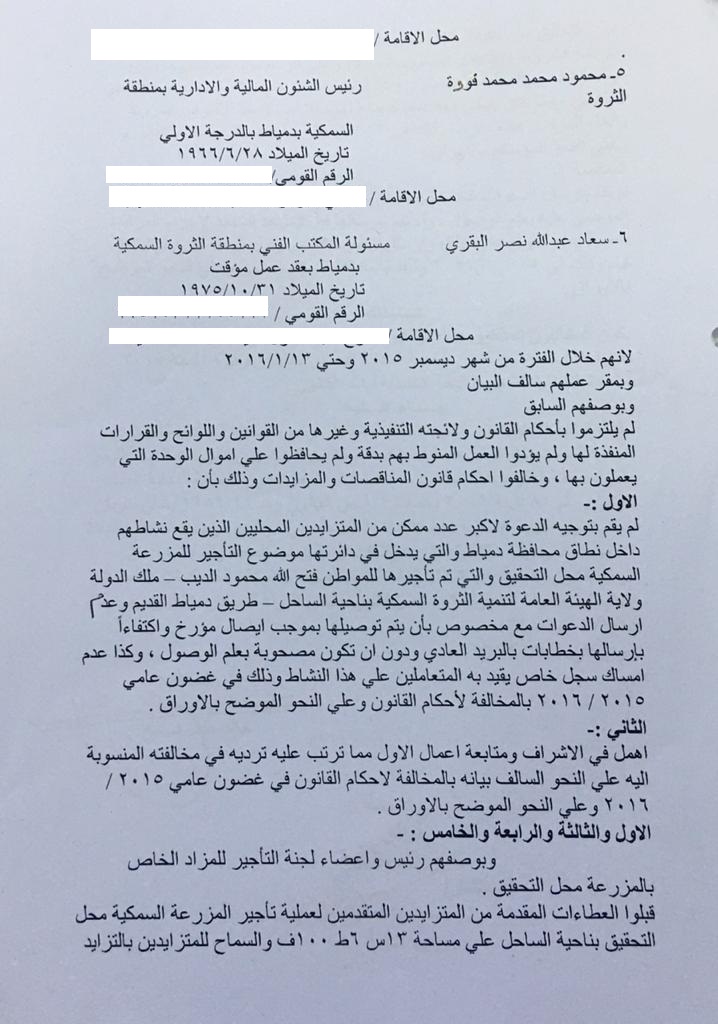 كشفت التحقيقات أن المحال الأول لم يقم بتوجيه الدعوة لأكبر عدد ممكن من المتزايدين المحليين الذين يقع نشاطهم داخل نطاق محافظة دمياط، والتي يدخل في دائرتها موضوع التأجير للمزرعة السمكية محل التحقيق، والتي تم تأجيرها للمواطن فتح الله محمود الديب، وهي من أملاك الدولة وتحت ولاية الهيئة العامة لتنمية الثروة السمكية بناحية الساحل طريق دمياط القديم.