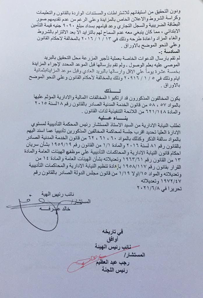 وأكدت النيابة الإدارية أن المحالين الأول والثالثة والرابعة والخامس بوصفهم رئيس وأعضاء لجنة التأجير للمزاد الخاص للمزرعة قبلوا العطاءات المقدمة من المتزايدين المتقدمين لعملية تأجير المزرعة السمكية المقامة على مساحة 100 فدان و6 قراريط و13 سهم، والسماح للمتزايدين بالتزايد دون التحقق من استيفائهم للإشتراطات والمستندات الواردة بالقانون والتعليمات وكراسة الشروط والإعلان الخاص بالمزايدة، ورغم عدم تقديمهم صور البطاقات الضريبية والسجل التجاري وعدم سداد 90910 جنيه قيمة التأمين الإبتدائي، مما كان ينبغي معه عدم السماح لهم بالتزايد إلا بعد الإلتزام بالشروط.