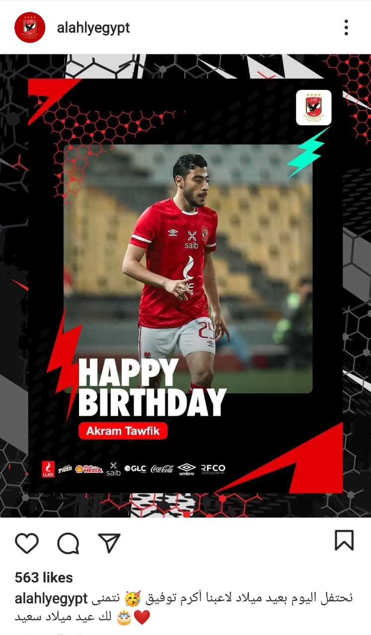 احتفل الحساب الرسمي للنادي الأهلي بعيد ميلاد أكرم توفيق لاعب الفريق، والذى أتم عامه الـ 24، ونشر حساب الأهلي على إنستجرام صورة لأكرم وعلق: "نحتفل اليوم بعيد ميلاد لاعبنا أكرم توفيق.. نتمنى لك عيد ميلاد سعيدا.