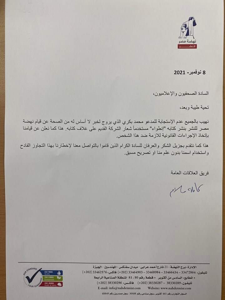 وجاء في بيان (نهصة مصر): سوف تقوم الدار باتخاذ كافة الإجراءات القانونية اللازمة لاستخدام شعار الشركة بدون تصريح مسبق، واستغلال اسم الدار للترويج لكتاب لا يندرج تحت قائمة إصداراتها.