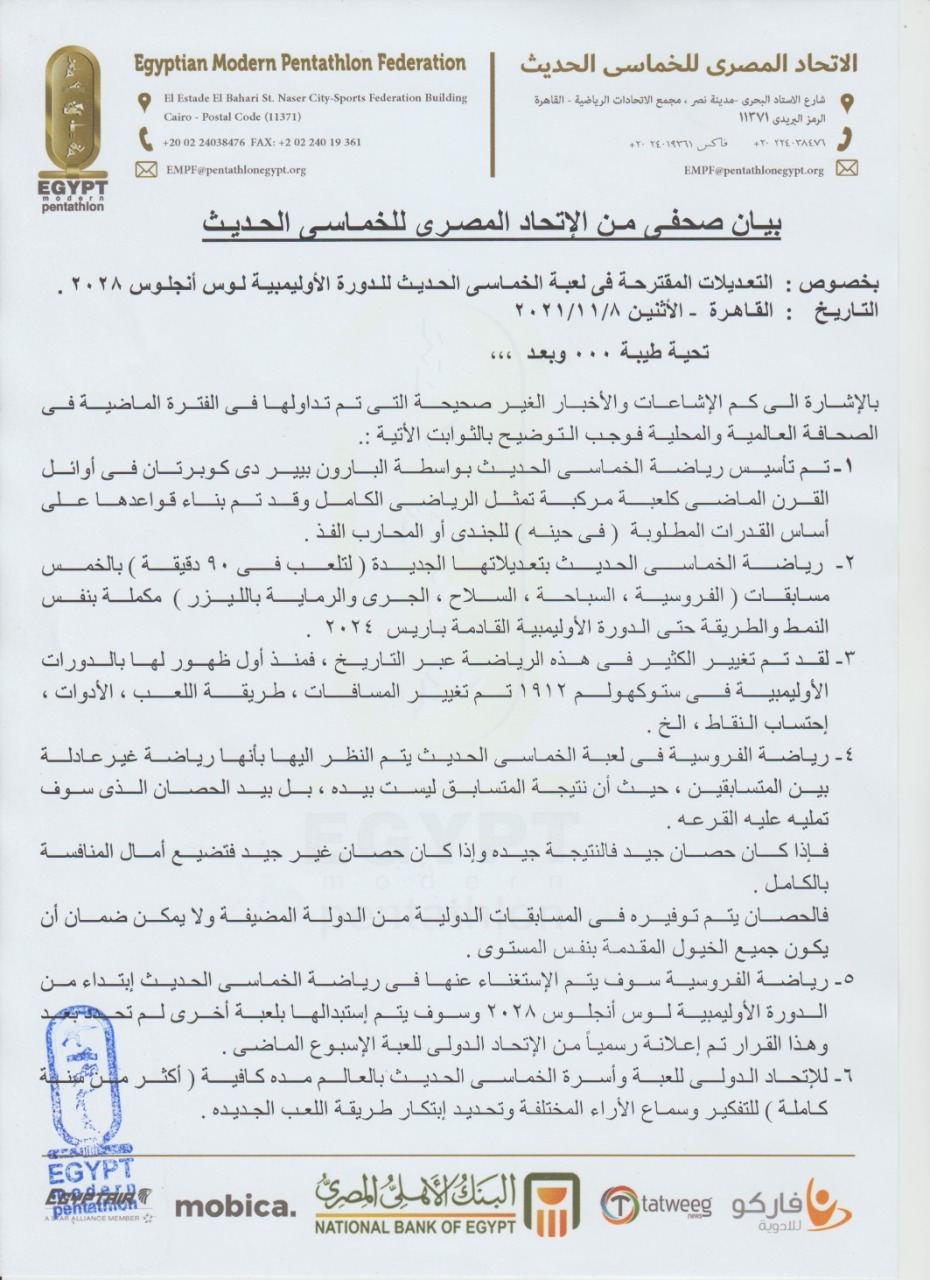 2- ريـاضـة الخمـاسـى الحـديـث بتعـديلاتهـا الجديـدة ( لتلعـب فـى 90 دقيقـة ) بالخمـس مسـابقـات ( الفـروسيـة، السبـاحـة، السـلاح، الجـرى والرمـايــة باللـيـزر ) مكملـة بنفـس النمـط والطـريقـة حتـى الـدورة الأوليمبيـة القـادمـة بـاريـس 2024 .