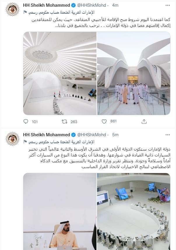 وكتب محمد بن راشد آل مكتوم تغريدة على تويتر "ترأست اجتماعًا لمجلس الوزراء في إكسبو دبي 2020 اعتمدنا خلاله الطلب المقدم من وزارة الداخلية بالبدء باختبار القيادة الذاتية للسيارات على طرق دولة الإمارات، ورفع تقرير للمجلس لاعتمادها بشكل دائم مستقبلًا في حال اعتمدت الوزارة تلك التقنية بالتنسيق مع الجهات المختصة".