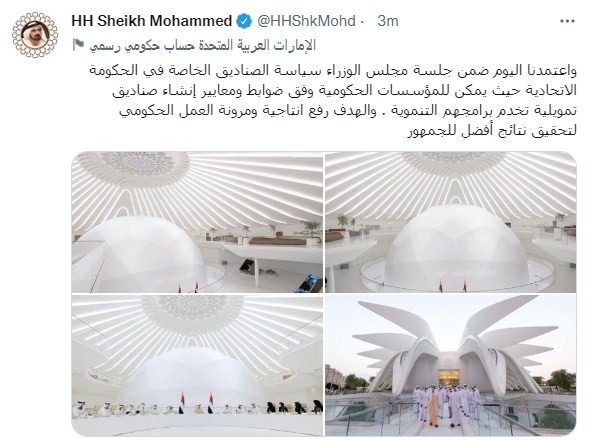 واختتم حديثه قائلًا: "واعتمدنا اليوم ضمن جلسة مجلس الوزراء سياسة الصناديق الخاصة في الحكومة الاتحادية حيث يمكن للمؤسسات الحكومية وفق ضوابط ومعايير إنشاء صناديق تمويلية تخدم برامجهم التنموية. والهدف رفع إنتاجية ومرونة العمل الحكومي لتحقيق نتائج أفضل للجمهور"