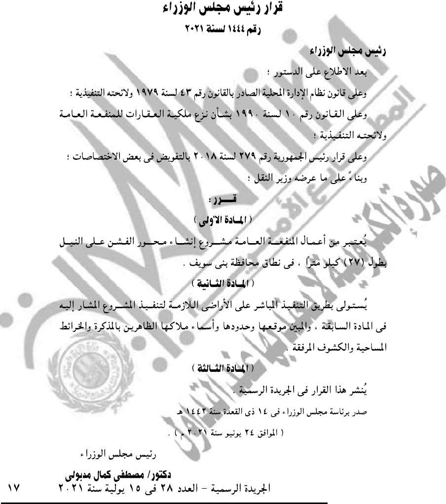 1ـ محور الفشن التنموي صدر بشأنه قرار مجلس الوزراء رقم 1444 لسنة 2021 بالموافقه على انشائه، لربط شرق النيل بالغرب مرورًا أعلى نهر النيل وترعة الابراهيمية وشريط السكة الحديد للوجه القبلي، ضمن خطة وزارة النقل نحو إنشاء محاور عرضية على النيل تربط شبكة الطرق شرق وغرب النيل.