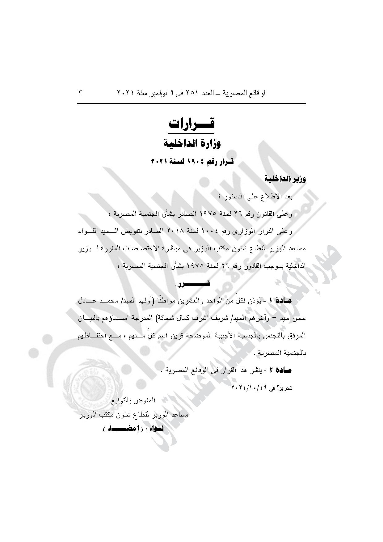 و القرار رقم 1905 لسنة 2021، بشأن الأذن لكل من الواحد والعشرن مواطنًا (أولهم خالد شريف محمد، وآخرهم خالد محمد حسن إمام نصار) المدرجة أسماؤهم بالبيان بالتجنس بالجنسية الأجنبية الموضحة قرين اسم كل منهم، مع عدم احتفاظهم بالجنسية المصرية.