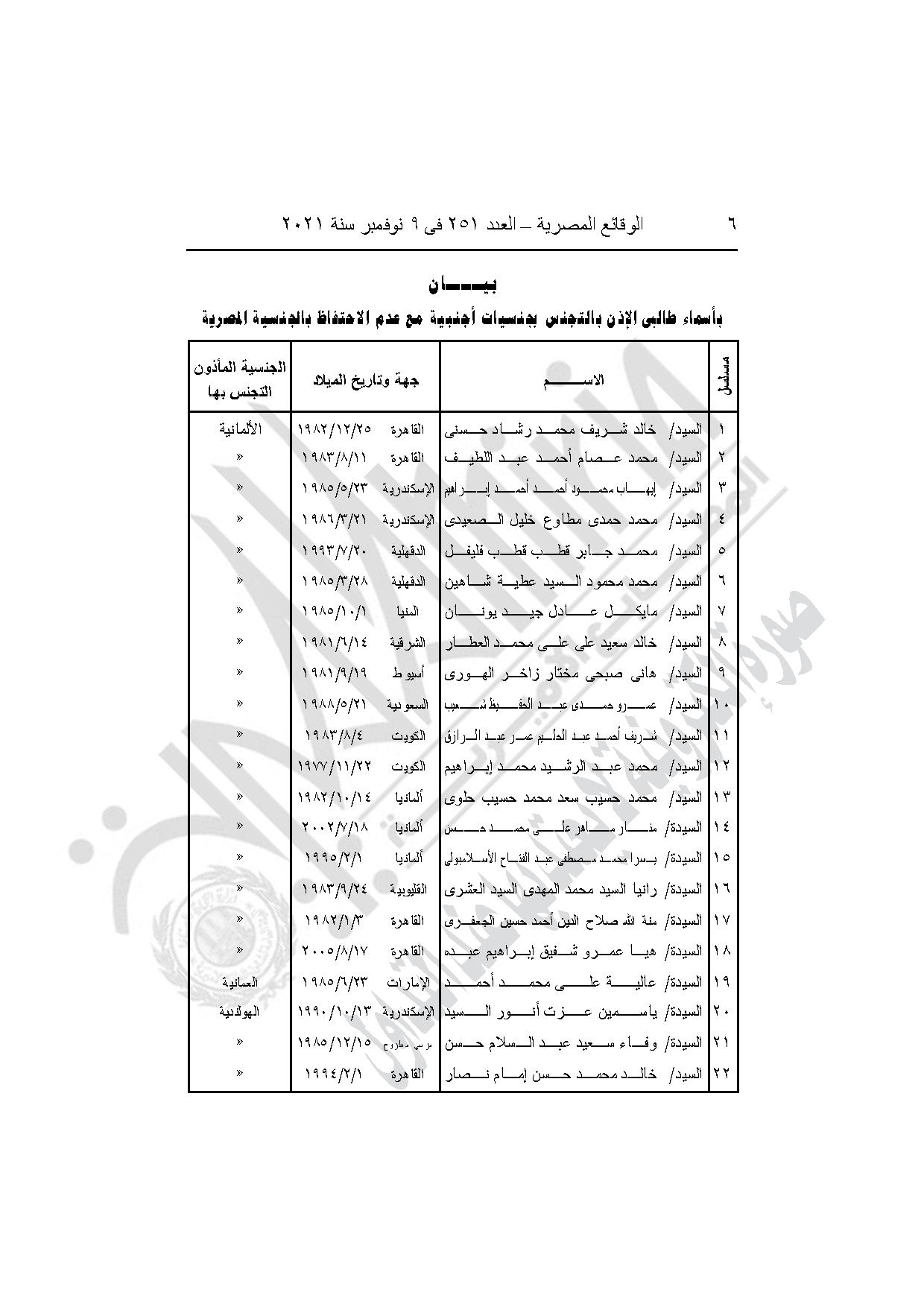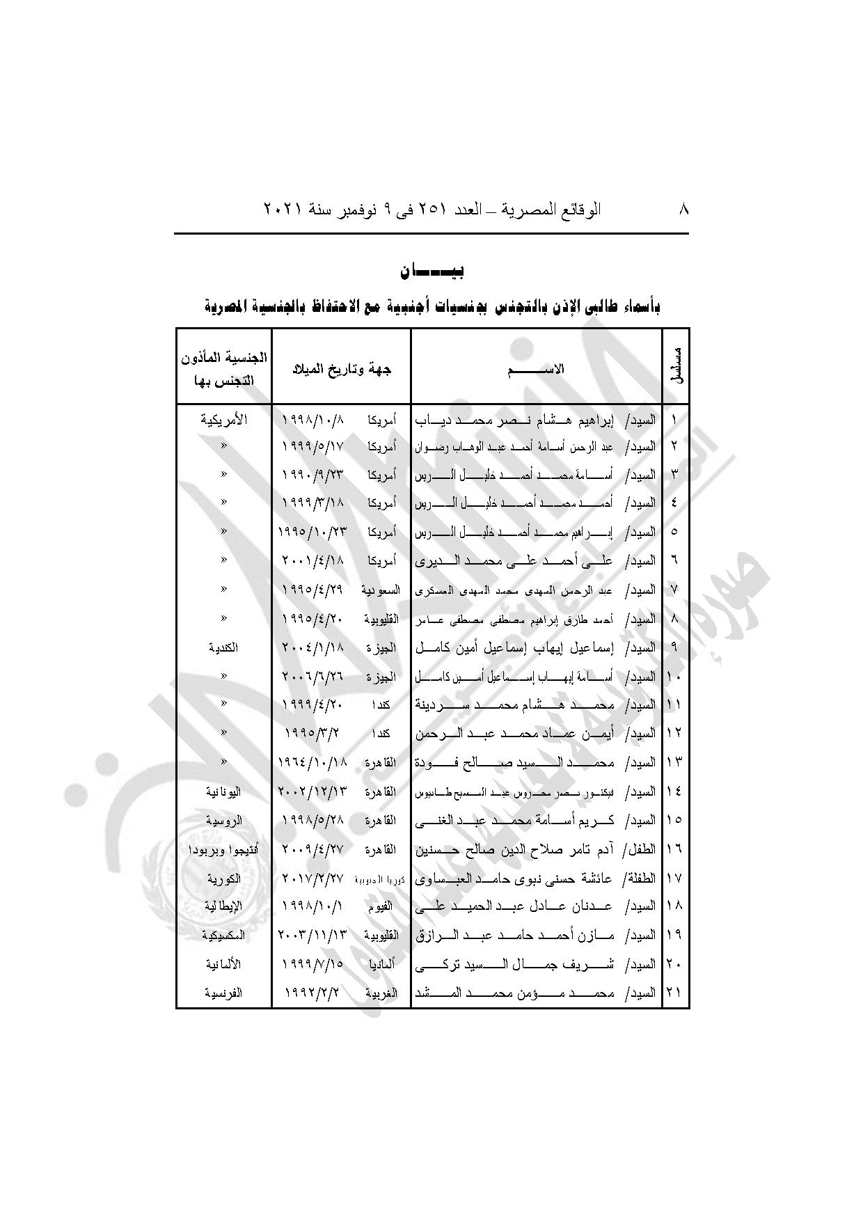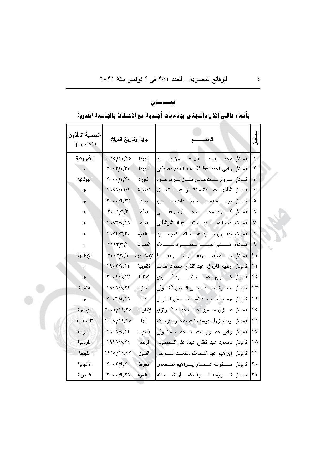 نشرت جريدة الوقائع المصرية في عددها رقم 251، الصادر في 9 نوفمبر 2021، قرارات وزارة الداخلية بسحب الجنسية المصرية من 21 مواطنًا، والأذن لـ42 مواطنًا التجنس بالجنسية الأجنبية مع احتفاظهم بالجنسية المصرية.