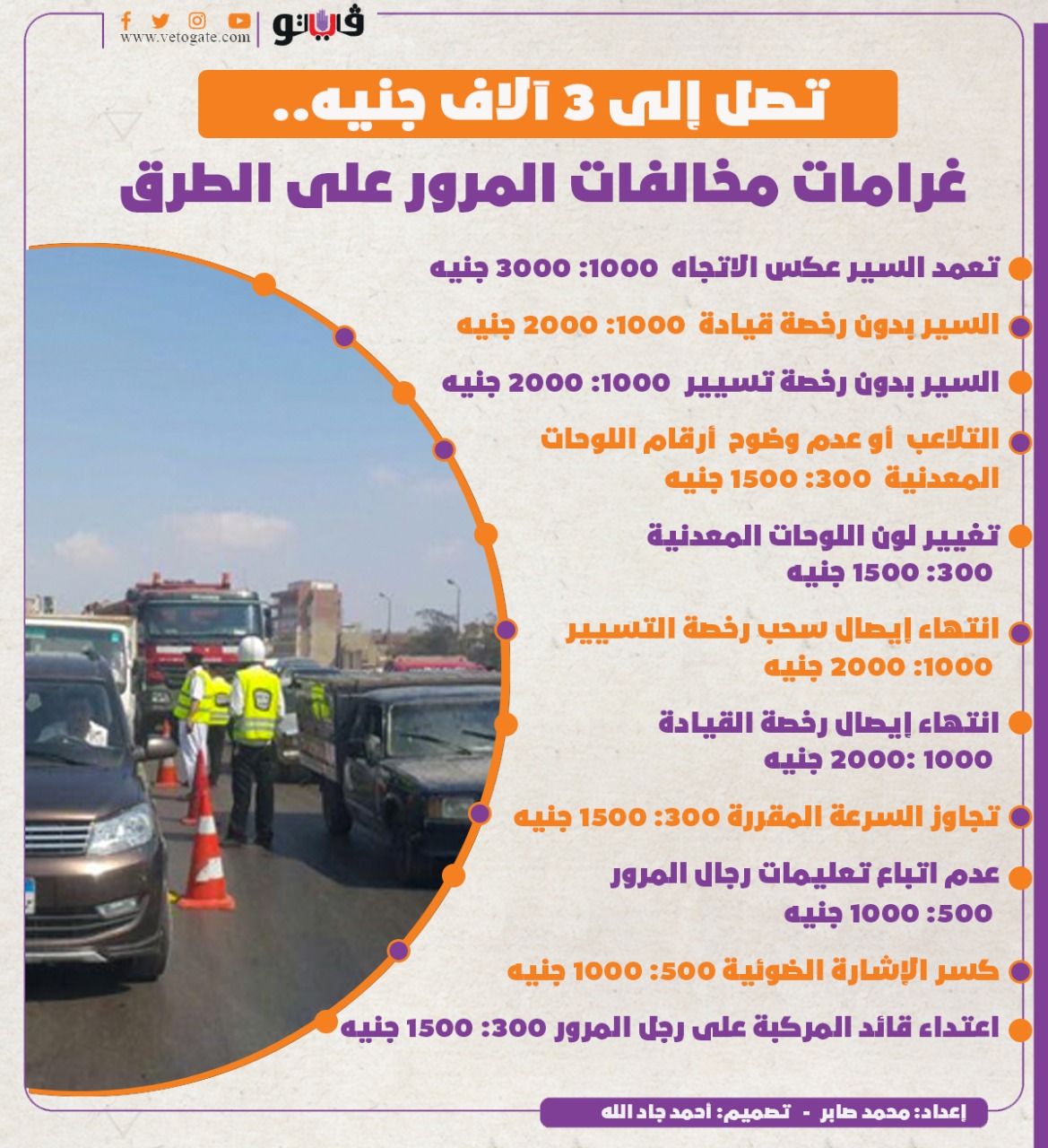 تصل إلى 3 آلاف جنيه.. غرامات مخالفات المرور على الطرق| إنفوجراف الأربعاء 10/نوفمبر/2021 - 04:24 م 11/10/2021 4:24:19 PM المرور محنمد صابر شارك طباعة 18 حجم الخط شارك طباعة تجاوز السرعة المقررة رخصة القيادة السير عكس الاتجاه تجاوز السرعة اللوحات المعدنية