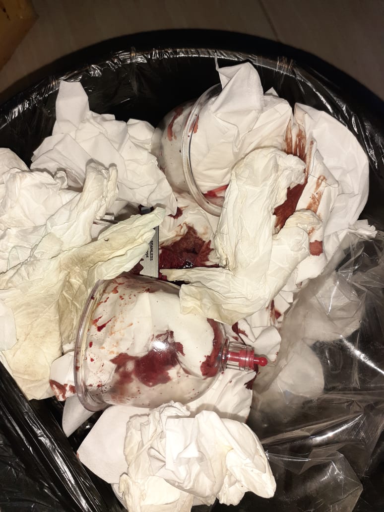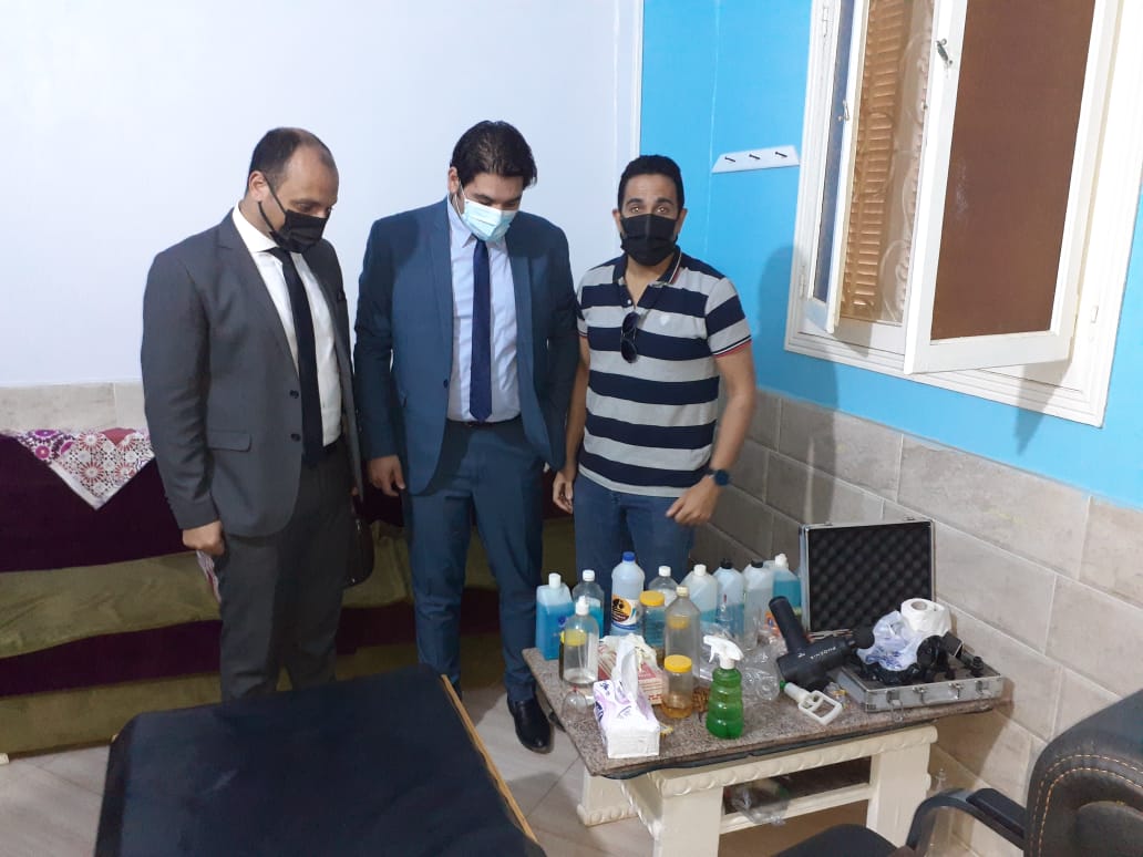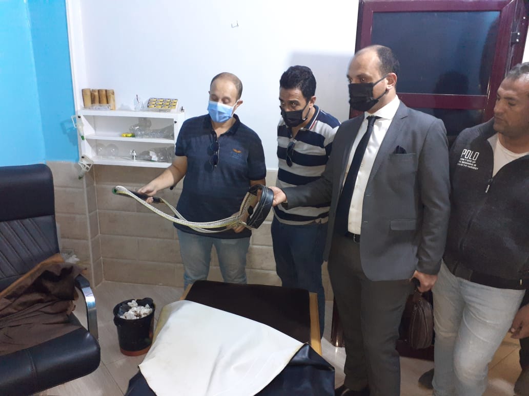 وبفحص وتفتيش المنشأة تبين وجود سرير للكشف وأدوات عمل جراحات الحجامة ومشارط ونفايات خطرة وعدم وجود سجل بيئي ورخص تداول النفايات وعقد محرقة، وجهاز مساج وأدوات خاصة بالعلاج الطبيعي يقوم باستخدامها على المرضى وهو غير مؤهل لذلك، وتم ضبط كمية كبيرة من "كاسات الحجامة" ومشد للرقبة وجرى تحريز المضبوطات بمعرفة إدارة العلاج الحر.