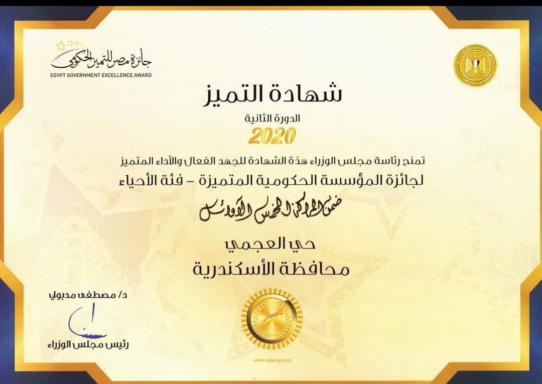 وكان شهد إعلان جوائز مصر للتميز الحكومي تحت رعاية الرئيس، عبد الفتاح السيسي رئيس جمهورية مصر العربية وصول حى العجمى ضمن أفضل خمسة أحياء علي مستوى الجمهورية .