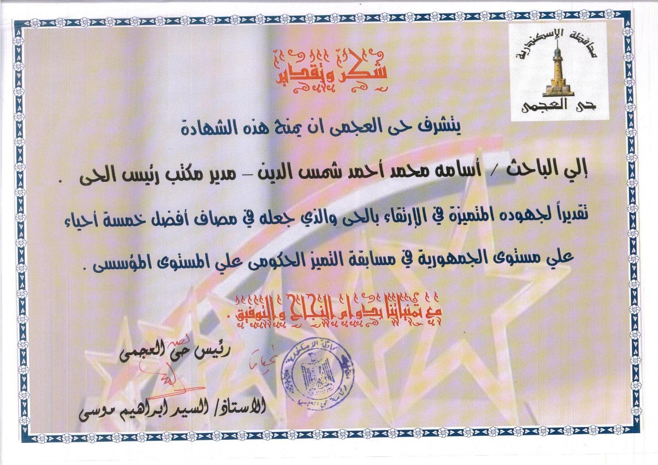 كرم السيد موسي، رئيس حى العجمى غرب الإسكندرية، فريق العمل المشارك في مسابقة أفضل حى وعددا من مديرى الإدارات والموظفين الذين ساهموا في حصول الحى علي المركز الرابع ضمن أفضل خمسة أحياء علي مستوى الجمهورية في مسابقة التميز الحكومى في المجال المؤسسي.