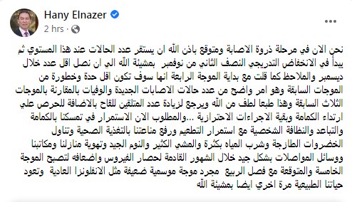 وكتب هاني الناظر تدوينة على الفيس بوك "نحن الآن في مرحلة ذروة الإصابة ومتوقع بإذن الله أن يستقر عدد الحالات عند هذا المستوى ثم يبدأ في الانخفاض التدريجي النصف الثاني من نوفمبر بمشيئة الله إلى أن نصل أقل عدد خلال ديسمبر".