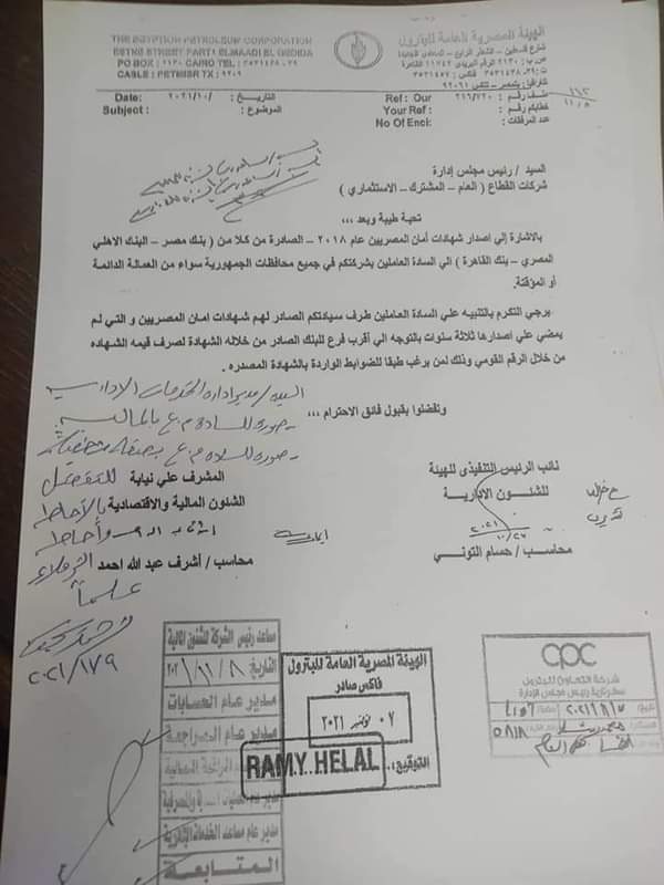 وجهت الهيئة العامة للبترول الموظفون في شركات قطاع البترول إلى ضرورة زيارة عدد من البنوك المسئولة عن شهادات أمان التي تعاقد عليها عاملون دائمون ومؤقتون بالبترول في شركات القطاع العام والاستثماري والمشترك.