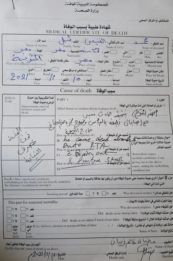 وأظهر تقرير طبي صادر عن وزارة الصحة التابعة للحكومة الليبية المؤقتة، أن الشاب المتوفى في الحادث الأخير، محمد الغنيمي شبل، من مواليد محافظة المنوفية ولقى حتفه نتيجة الحادث ما أسفر وجود إصابات بالغة فى رأسه وخروج جزء من الدماغ ووضعت الجثة تحت تصرف النيابة، ورجحت مصادر وصول جثته القاهرة ليل الأربعاء.