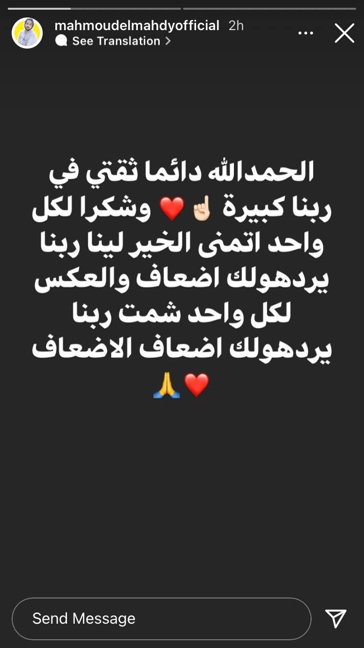 وقال "المهدي" من خلال خاصية "ستوري" عبر "إنستجرام":"الحمد الله ثقتي في ربنا كبيرة وشكرا لكل واحد أتمني الخير لينا ربنا يردهولك أضعاف والعكس لكل واحد شمت ربنا يرضهولك أضعاف ألاضعاف.