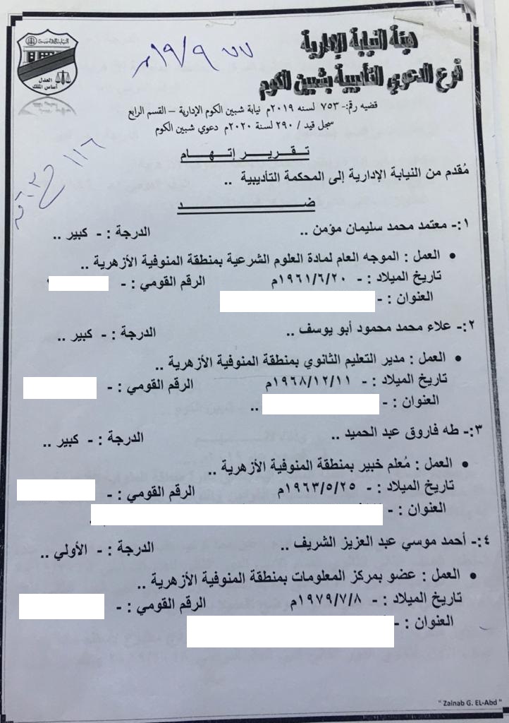 قائمة المحالين شملت كلًا من معتمد محمد سليمان، موجه عام العلوم الشرعية بمنطقة المنوفية الأزهرية وعلاء محمد محمود، مدير التعليم الثانوي بالمنطقة وطه فاروق عبد الحميد، معلم خبير وأحمد موسى عبد العزيز، عضو بمركز المعلومات وعبد الهادي صابر عبد الهادي، عضو بمكتب رئيس الإدارة المركزية بمنطقة المنوفية الأزهرية وعواطف فتحي السيد، مديرة إدارة رياض الأطفال وحسام زكريا شعيب، مدير إدارة رعاية الطلاب وأشرف محمد صلاح، مسؤول المطبعة