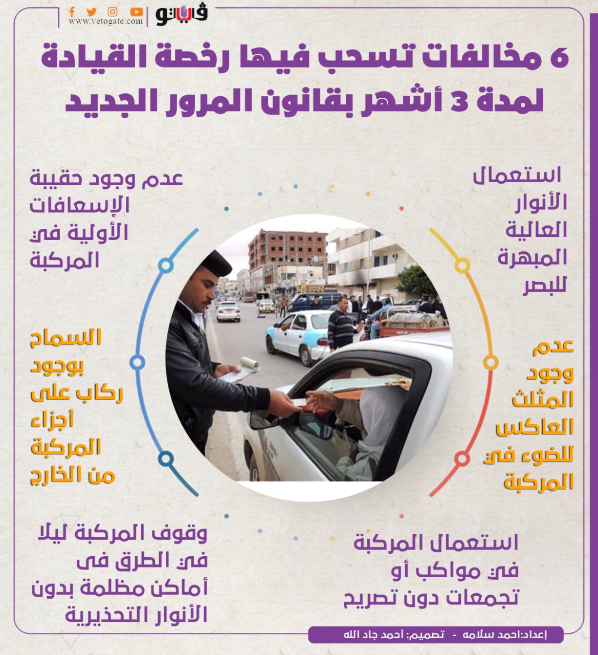 6 مخالفات تسحب فيها رخصة القيادة لمدة 3 أشهر بقانون المرور الجديد |إنفوجراف الخميس 11/نوفمبر/2021 - 12:41 م 11/11/2021 12:41:39 PM حالات سحب رخصة القيادة لمدة 3 أشهر أحمد سلامة شارك طباعة 18 حجم الخط شارك طباعة رخصة القيادة قانون المرور الجديد حالات سحب رخصة القيادة مخالفات سحب رخصة القيادة سحب رخصة القيادة تعديلات قانون المرور الجديد