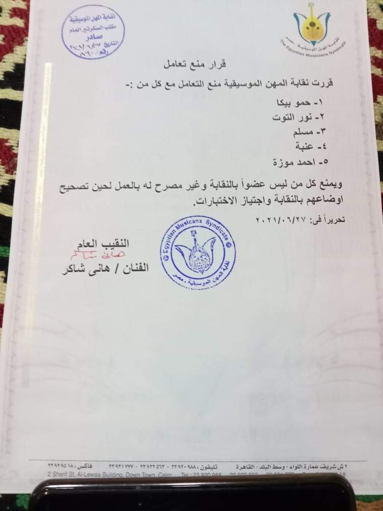 على الجانب الأخر، كان مجلس نقابة الموسيقيين، أصدر قرار منذ شهرين بمنع التعامل مع حمو بيكا ونور التوت ومسلم وعنبة وأحمد موزة، على أن يمنع كل من ليس عضوًا بالنقابة وغير مصرح له بالعمل لحين تصحيح أوضاعهم بالنقابة واجتياز الاختبارات.