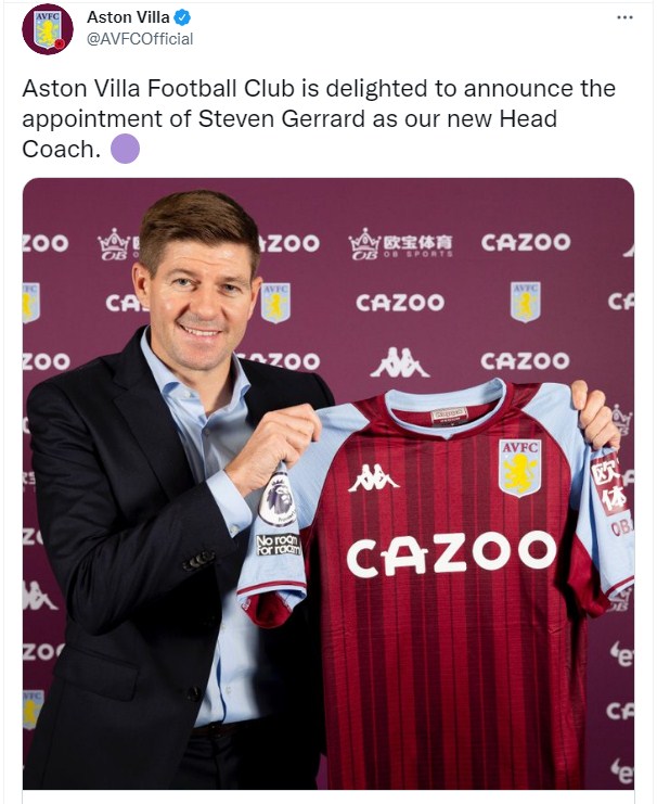 وكتب نادي أستون فيلا تغريدة على تويتر "يسر نادي أستون فيلا لكرة القدم الإعلان عن تعيين ستيفن جيرارد مدربًا جديدًا لنا"