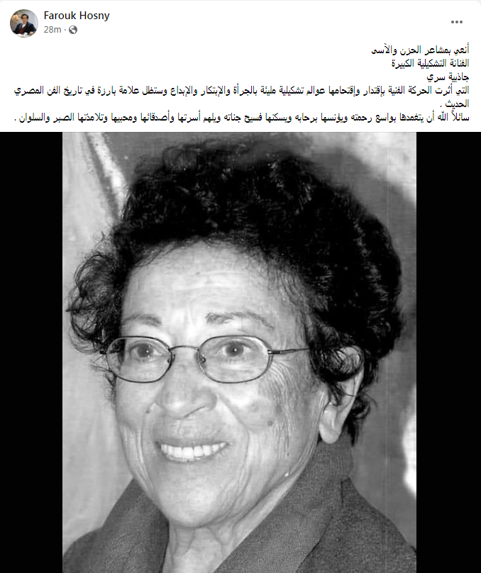 نعى الفنان فاروق حسني وزير الثقافة الأسبق، عبر حسابه الشخصي على موقع التواصل الاجتماعي "فيس بوك" الفنانة التشكيلية الراحلة جاذبية سري، والتي وافتها المنية مساء أمس الأربعاء عن عمر ناهز الـ96 عاما.