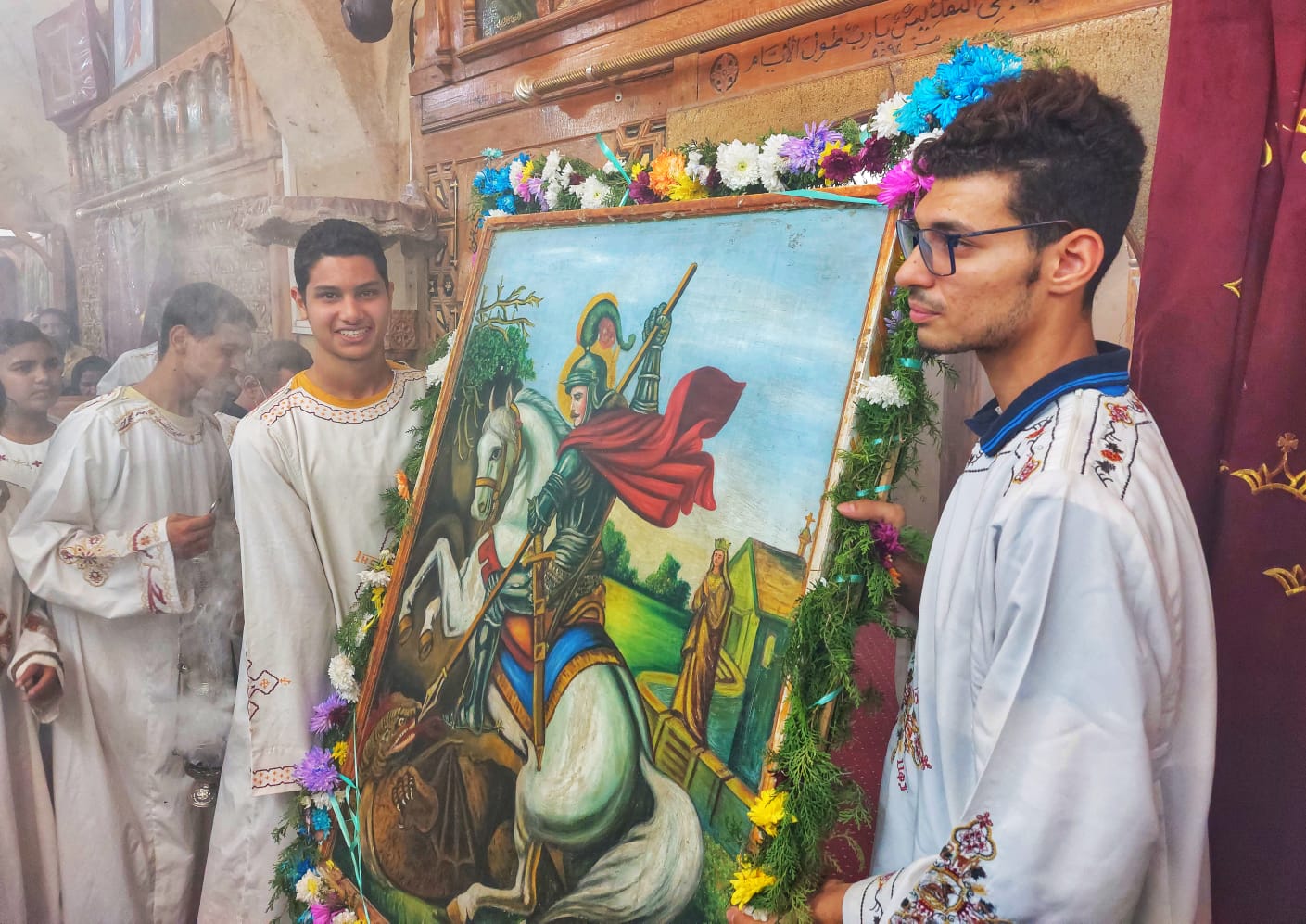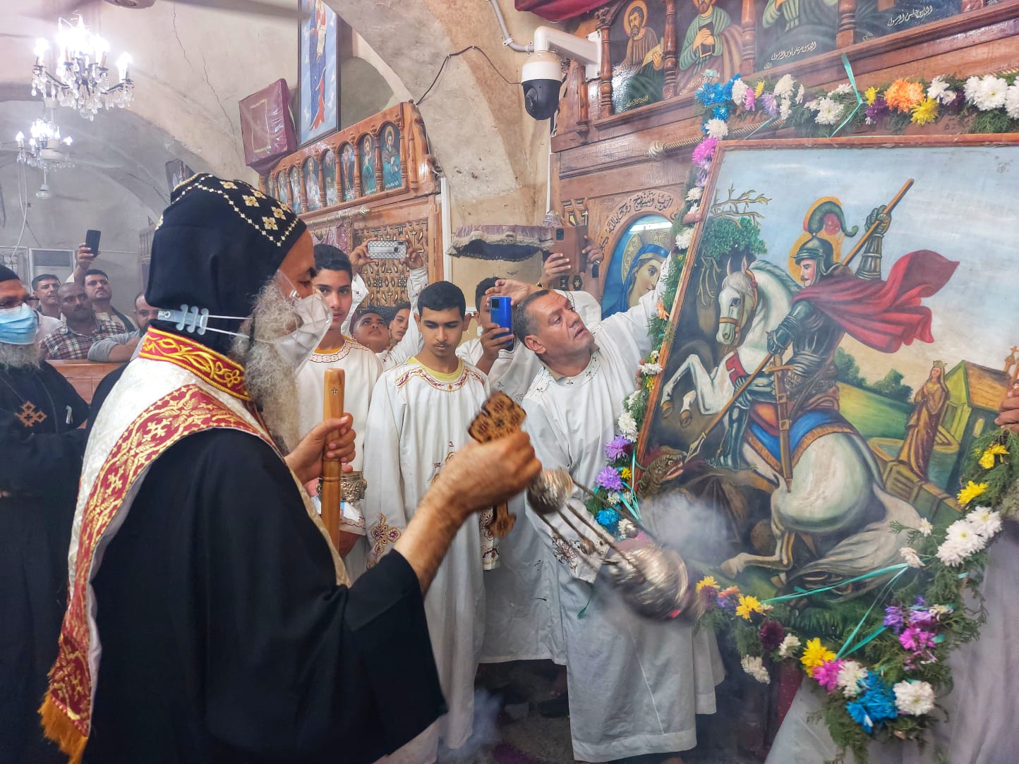 واصطف خلف الأيقونة عدد كبير من الزوار، وتعالت أصوات الترانيم والتسابيح والمدائح والزغاريد من النساء حين رؤيتهن أيقونة الشهيد مارجرجس الروماني، داخل الكنيسة الأثرية للدير.