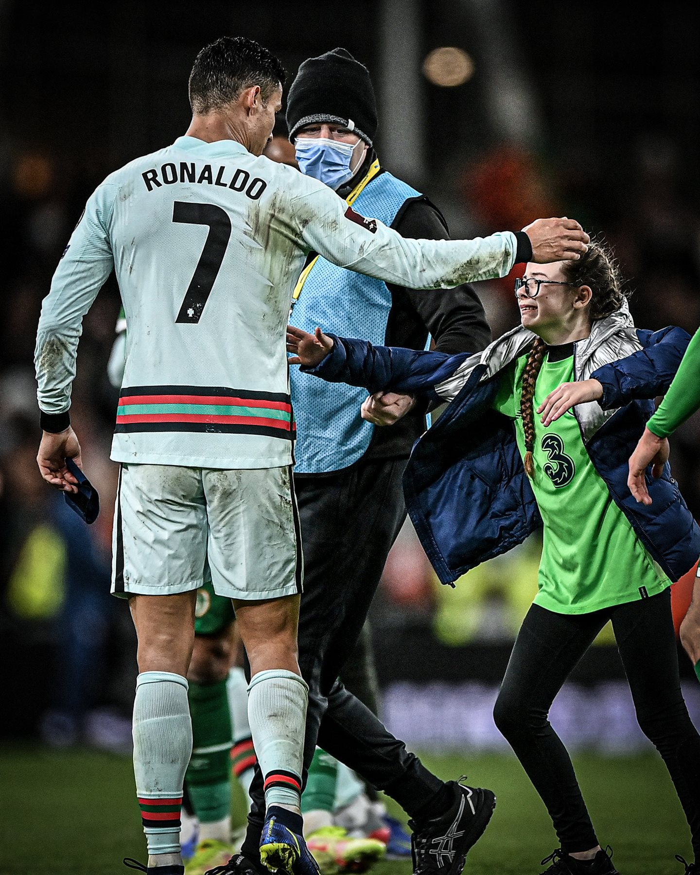 منح النجم البرتغالي كريستيانو رونالدو قميصه لطفلة مشجعة، اجتاحت الملعب خلال مباراة منتخب أيرلندا ومنتخب البرتغال، في تصفيات كأس العالم قطر 2022 الخاصة بأوروبا، والتي انتهت بالتعادل السلبي.