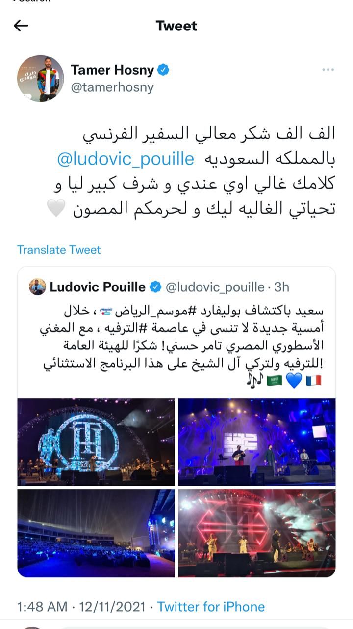السفير الفرنسي بالسعودية يصف تامر حسني بـ«الأسطوري الملهم»..والجمهور يؤكد: أنجح مطرب مصري غنى بالمملكة