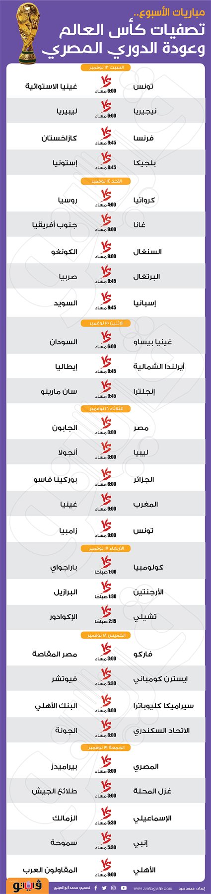 مباريات الأسبوع.. تصفيات كأس العالم وعودة الدوري المصري | إنفوجراف