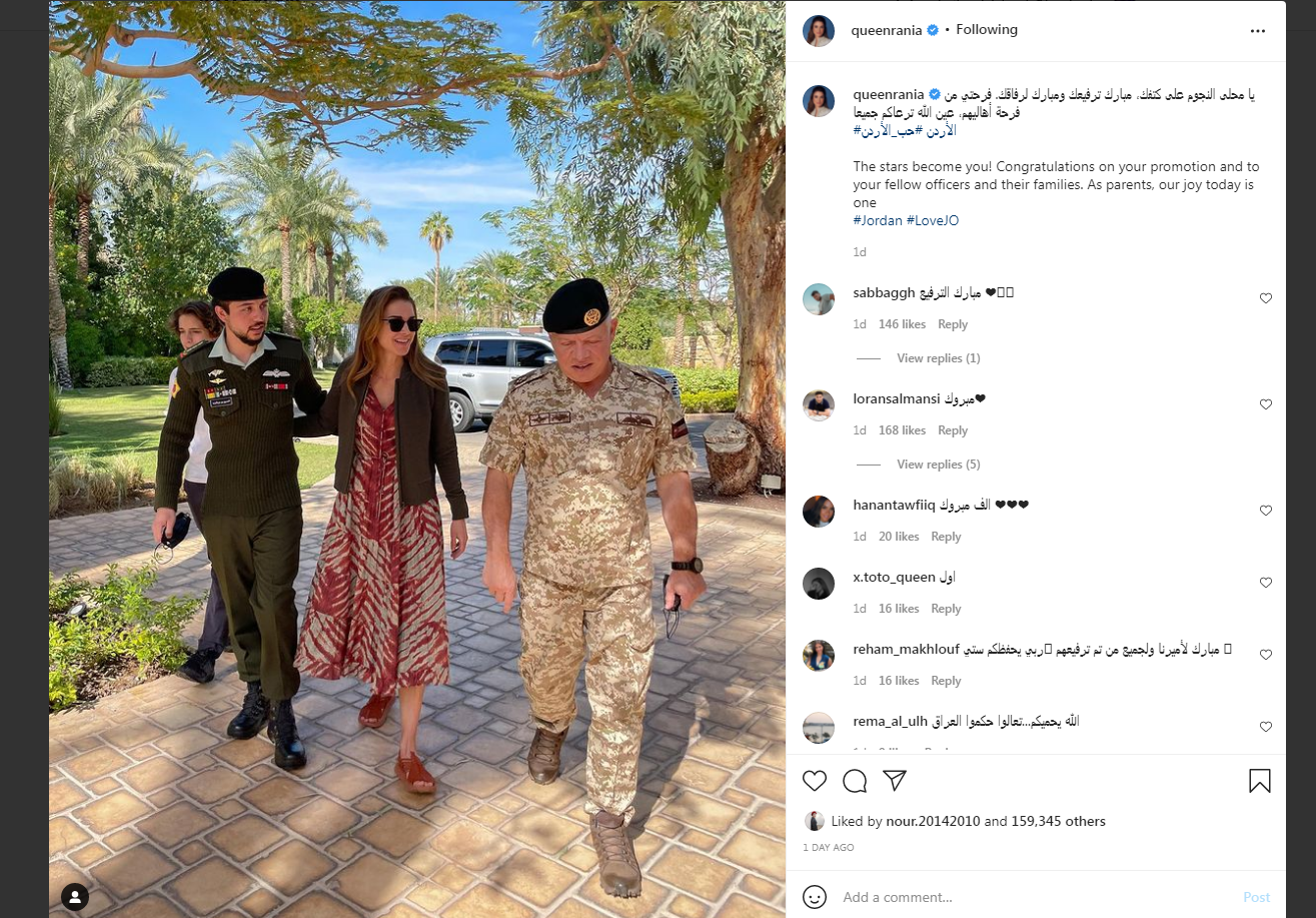 كما احتفلت المكلة رانيا بترقية ولي العهد عبر حسابها الرسمي على "إنستجرام"، ونشرت صورة جمعتها به وبالملك معلقة: "يا محلى النجوم على كتفك، مبارك ترفيعك ومبارك لرفاقك. فرحتي من فرحة أهاليهم، عين الله ترعاكم جميعا".