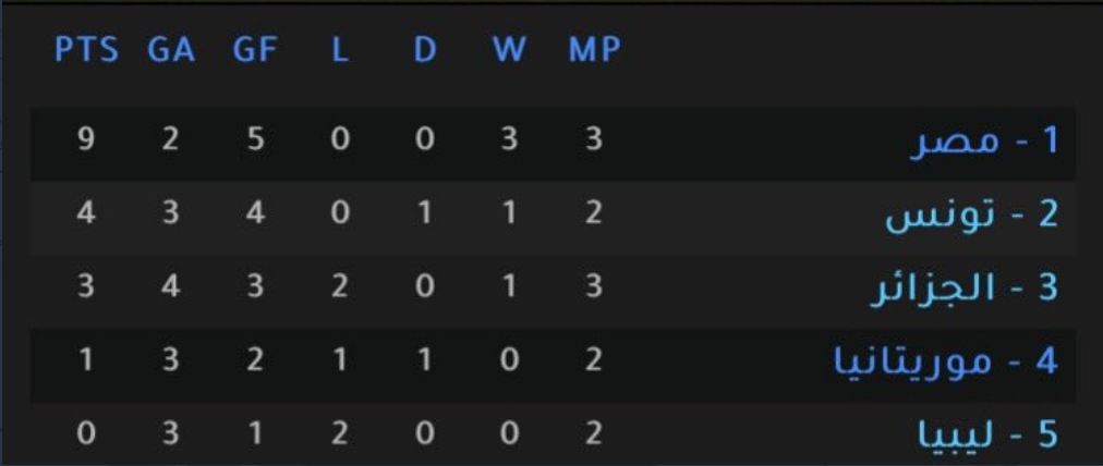 فيتو ترصد ترتيب المنتخبات الخمس المشاركة فى البطولة على النحو الموضح بالجدول التالي: