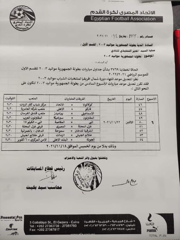 تعديل موعد الجولة السادسة بدوري الجمهورية للناشئين مواليد 2003