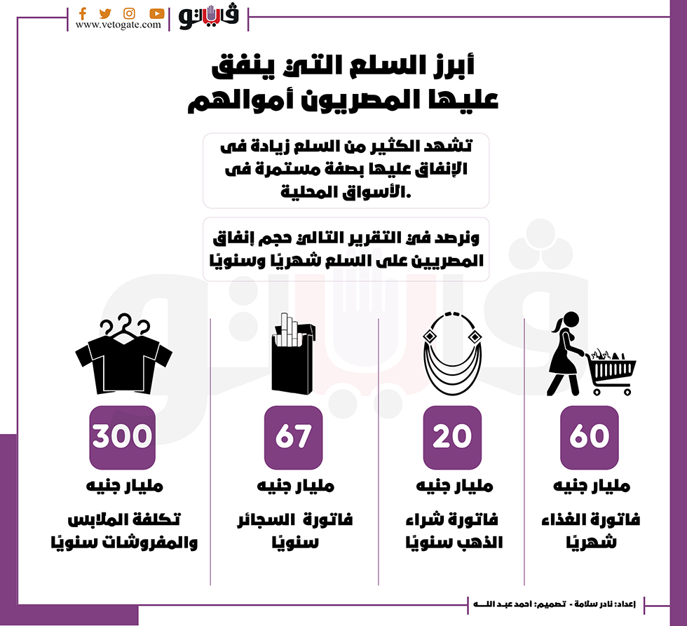 أبرز السلع التي ينفق عليها المصريون أموالهم|إنفوجراف الأحد 14/نوفمبر/2021 - 07:16 م 11/14/2021 7:16:23 PM الملابس الجاهزة نادر سلامة شارك طباعة 18 حجم الخط شارك طباعة المصريين الأسواق المحلية الانفاق حجم المبيعات الأسواق