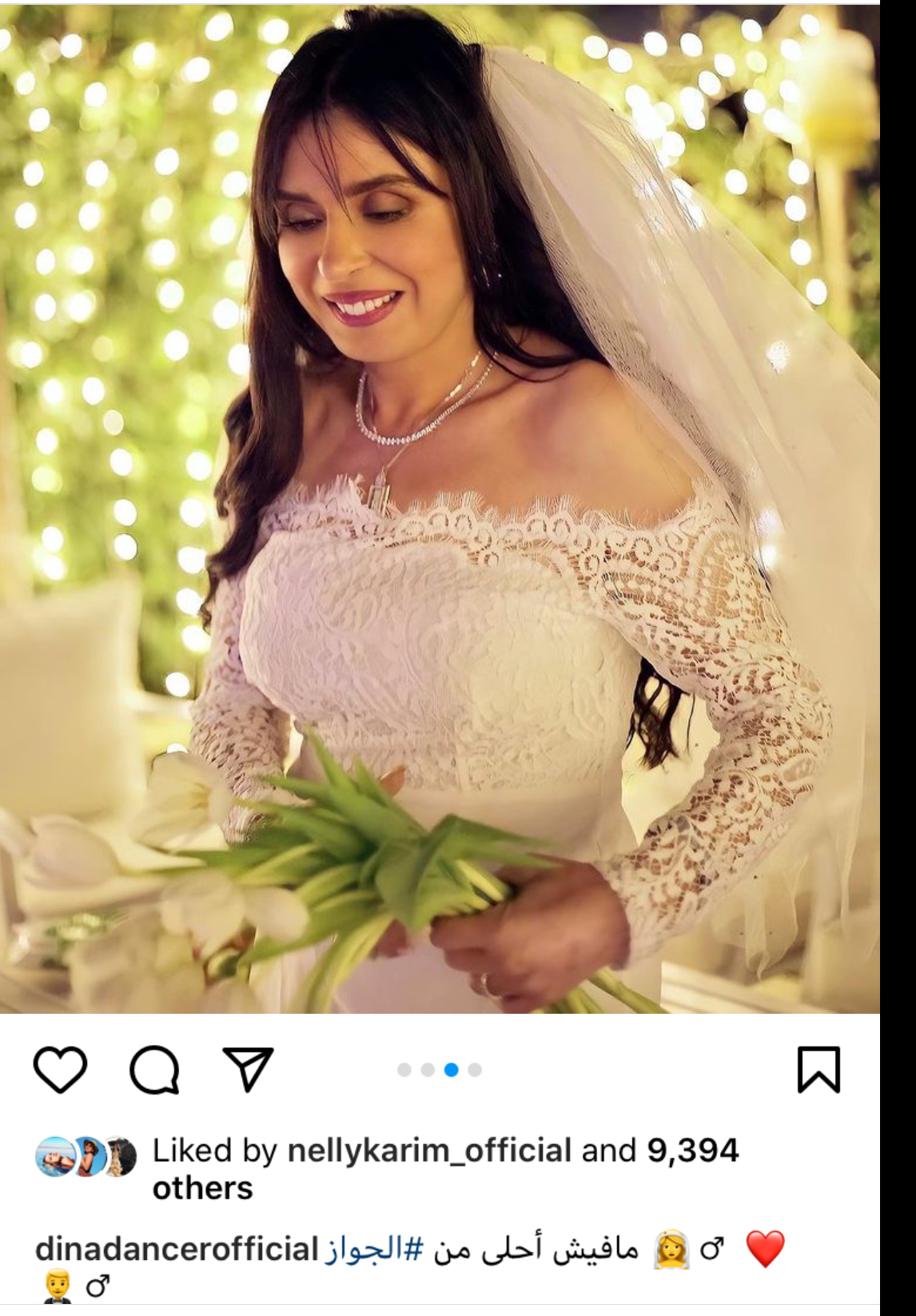 وفي هذا السياق، نشرت دينا عبر حسابها على إنستجرام، عددا من الصور وهي مرتدية فستان الزفاف وعلقت عليها: "مفيش أحلى من الجواز"، وانهالت التعليقات والمباركات من جمهورها.
