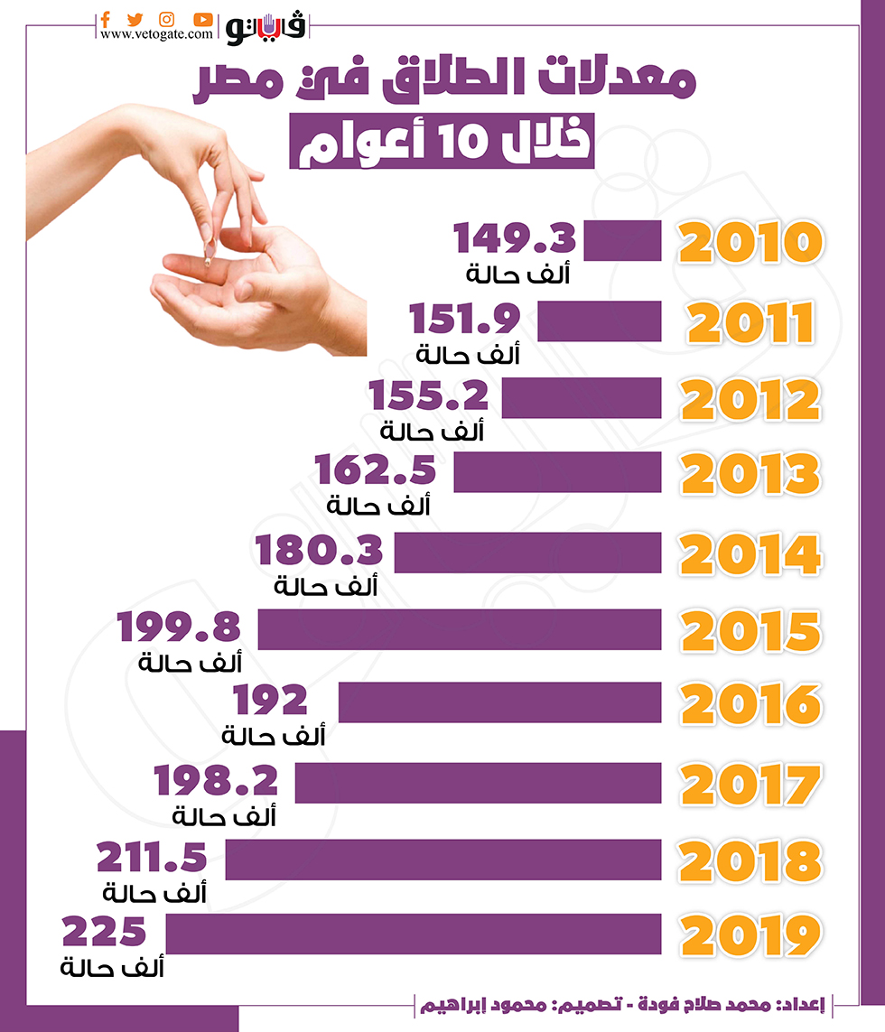 معدلات الطلاق في مصر خلال 10 أعوام | إنفوجراف الإثنين 15/نوفمبر/2021 - 07:08 م 11/15/2021 7:08:43 PM الطلاق محمد صلاح فودة شارك طباعة 18 حجم الخط شارك طباعة حالات الطلاق الطلاق في مصر أحكام الطلاق أسباب الطلاق في مصر ارتفاع نسبة الطلاق