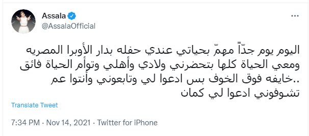 وكتبت أصالة قائلة: "اليوم يوم جدّا مهمّ بحياتي عندي حفله بدار الأوبرا المصرية ومعي الحياة كلها بتحضرني ولادي وأهلي وتوأم الحياة فائق.. خايفة فوق الخوف بس ادعوا لي وتابعوني وأنتوا عم تشوفوني ادعوا لي كمان".