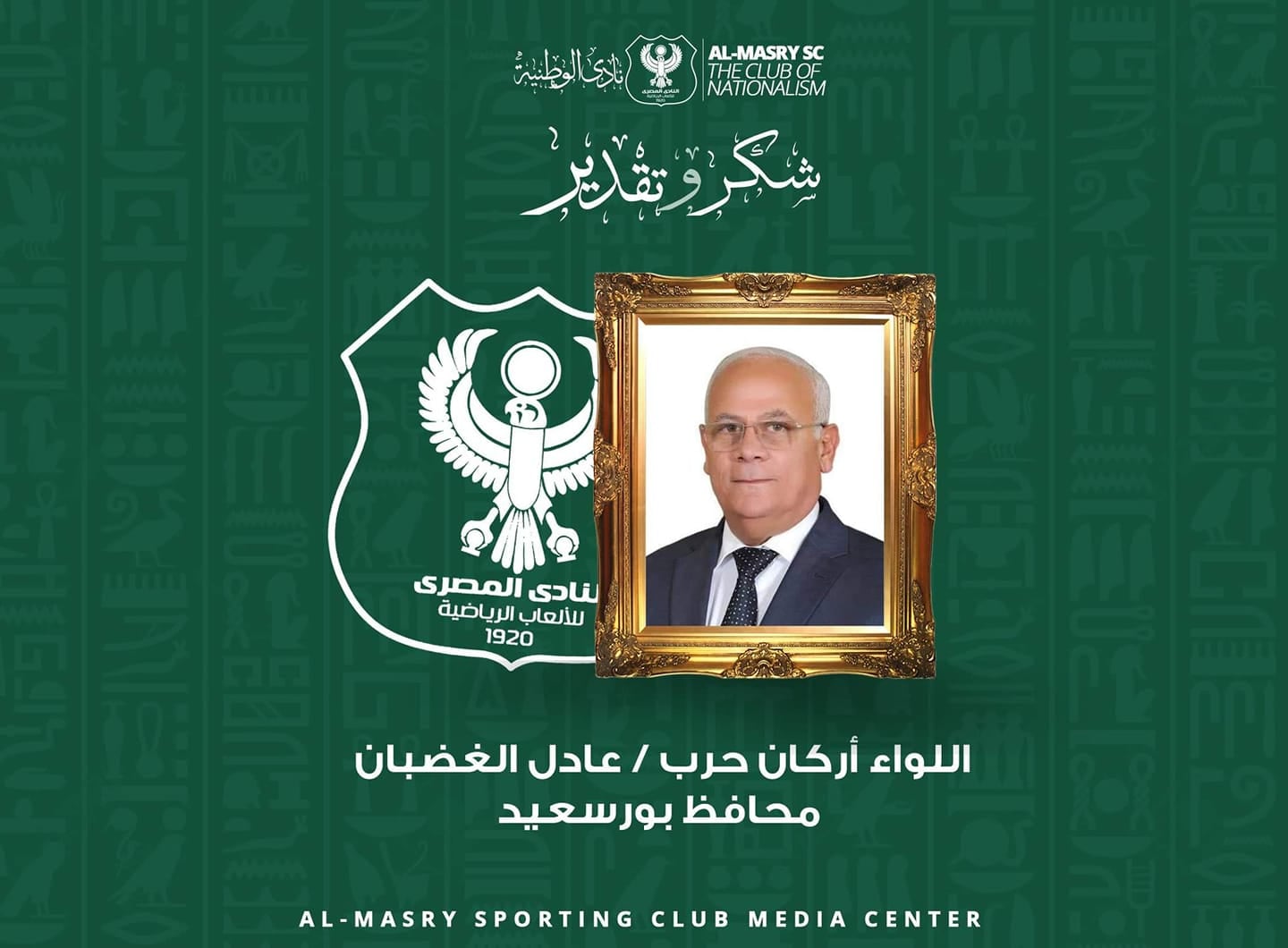 توجه مجلس إدارة النادي المصري برئاسة سمير حلبية بالشكر والتقدير للواء أركان حرب عادل الغضبان محافظ بورسعيد، وذلك بعد توقيع ظهر اليوم لعقود إنساد انشاء الأستاد الجديد للنادي المصري مع وزارة الشباب والرياضة