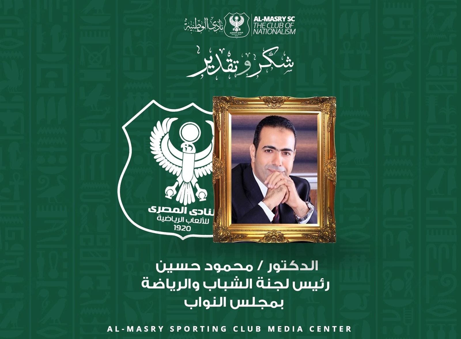 وفي هذا الإطار يتوجه مجلس إدارة المصري بالشكر كذلك للدكتور محمود حسين رئيس لجنة الشباب والرياضة بمجلس النواب على مجهوداته الكبيرة في هذا الشأن والتي توجت اليوم بتوقيع عقود الإنشاء للاستاد الجديد الذي يأتي بناءه تنفيذًا لتوجيهات فخامة الرئيس عبد الفتاح السيسي رئيس الجمهورية - مؤسس الجمهورية الجديدة - بإنشاء ستاد جديد للنادي المصري وفق أحدث الطرازات العالمية.