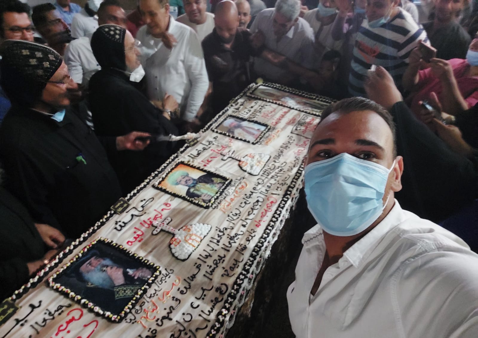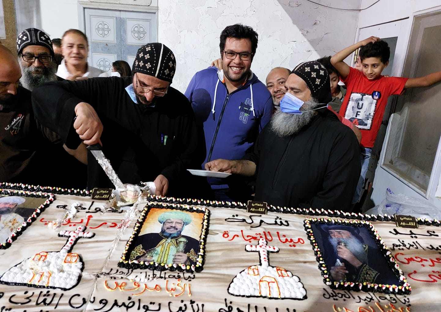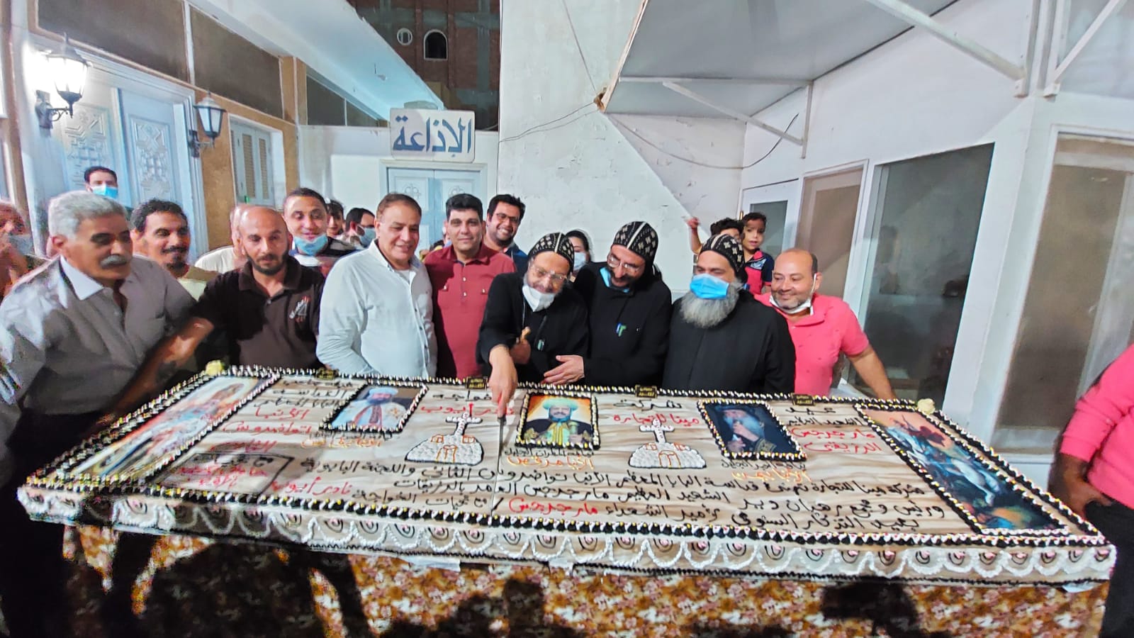 والتف العديد من الآباء الكهنة وأبناء الإيبارشية والمحتفلين حول التورتة التي كانت تتزين بصورة الشهيد العظيم مارجرجس، والبابا تواضروس الثاني، وصور أعضاء اللجنة البابوية المشرِفة على احتفالات الدير، والأنبا مرقس مطران شبرا الخيمة والنائب البابوي للدير، والأنبا بيمن أسقف نقادة وقوص، والأنبا يؤانس أسقف أسيوط.
