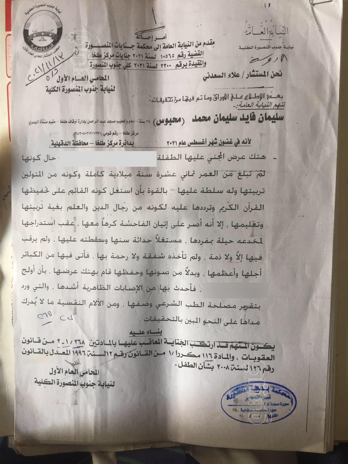 تنفرد "فيتو" بـ نشر أمر إحالة سليمان فايد إمام وخطيب مسجد والمتهم بـ “هتك عرض” طفلة عمرها 11 عاما في محافظة الدقهلية.