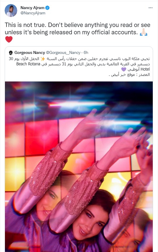 وكتبت نانسي عجرم تغريدة على تويتر "هذا ليس صحيحًا. لا تصدقوا أي شيء تقرأوه أو تروه ما لم أذكره على حساباتي الرسمية"