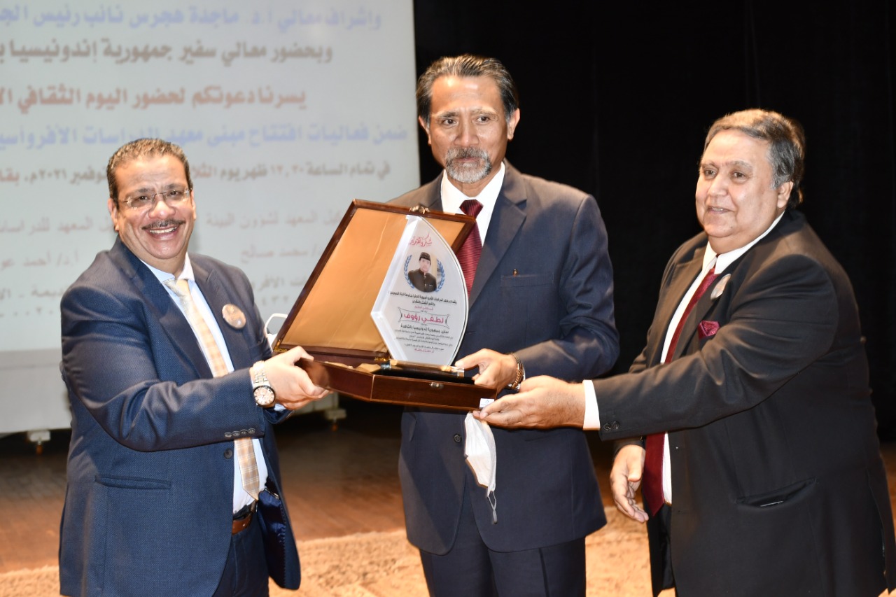 جاء ذلك أثناء الاحتفالية التى نظمتها الجامعة اليوم الثلاثاء الموافق ١٦ نوفمبر، بمناسبة افتتاح مبنى معهد الدراسات الأفرو آسيوية العليا بالجامعة، واحتفالية اليوم الثقافى المصرى الإندونيسى تحت رعاية الدكتور أحمد زكي حسين رئيس الجامعة وإشراف عام الدكتورة ماجدة هجرس نائب رئيس الجامعة للدراسات العليا والبحوث، وبحضور سفير جمهورية إندونيسيا بالقاهرة الدكتور لطفي رؤوف والدكتور محمد شقيدف نائب رئيس الجامعة لشئون التعليم والطلاب والسادة عمداء الكليات والسيدة هدى فرج أمين عام الجامعة والورد الإندونيسى المرافق لسفير أندونيسيا ولفيف من القيادات والاعلامين.