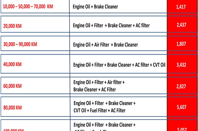 وجاءت صيانة 10 آلاف كم و50 ألف كم و70 ألف كم بقيمة 1417 جنيه بينما جاءت صيانة 20 ألف كم بقيمة 2437 جنيه وصيانة 30 ألف و90 ألف كم بسعر 1807 جنيه.