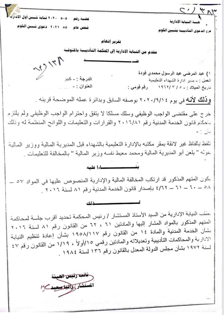 قررت النيابة الإدارية في القضية رقم 138 لسنة 64 قضائية عليا إحالة مدير عام إدارة الشهداء التعليمية بمحافظة المنوفية للمحاكمة التأديبية العاجلة بعد ثبوت خروجه على مقتضى الواجب الوظيفي وقيامه بسب محمد معيط وزير المالية والتلفظ بألفاظ غير لائقة في حقه