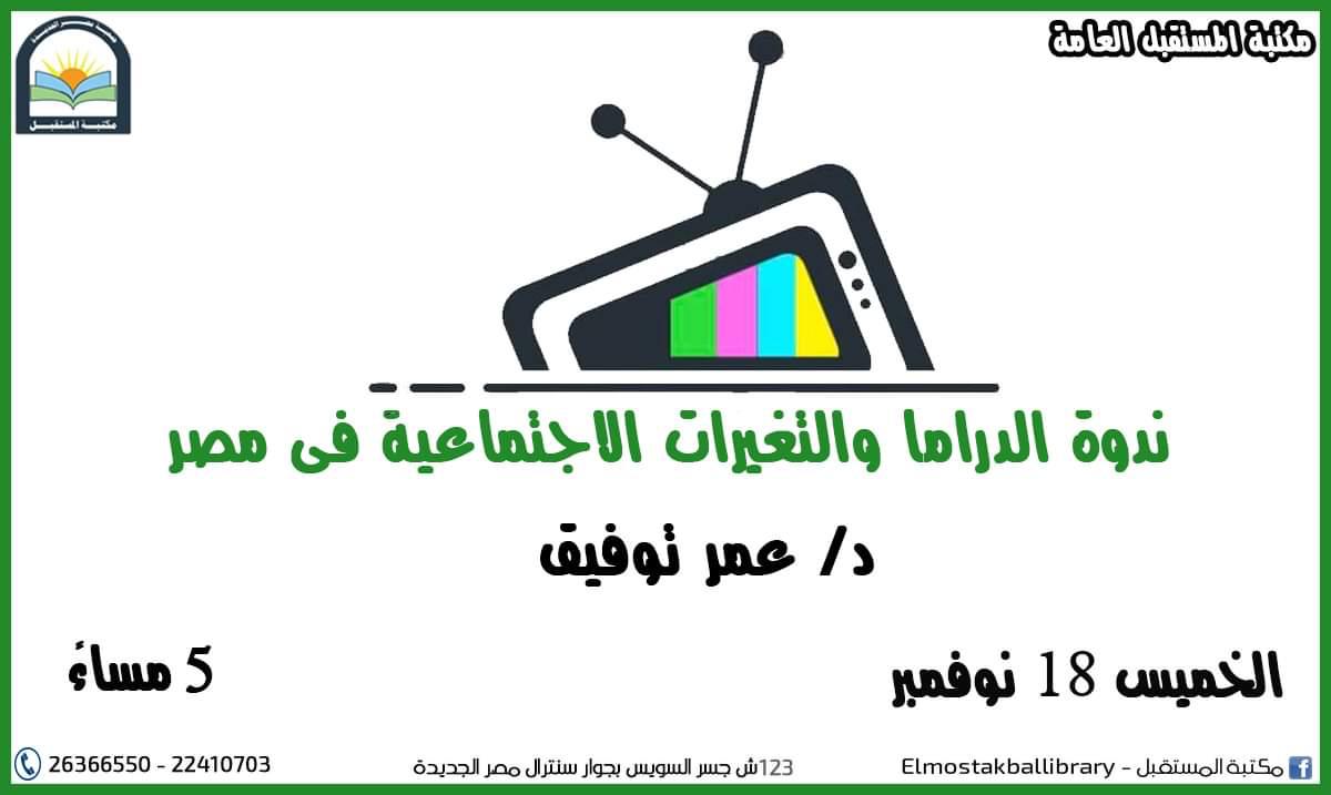 تشهد مكتبة المستقبل إطلاق ندوة الدراما والتغيرات الاجتماعية في مصر، وتشمل مجالات الدراما المتنوعة من مسرح وتلفزيون وسينما.