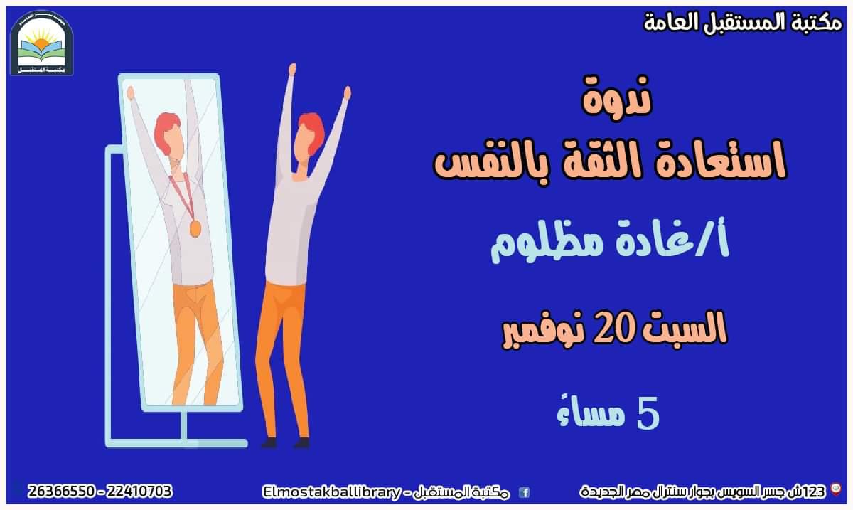 وأعلن فؤاد عدلى، مدير مكتبة المستقبل أن المكتبة سوف تنظم في الخامسة من مساء السبت 20 نوفمبر الجاري ندوة بعنوان "استعادة الثقة بالنفس"، تحاضر فيها الصحفية الدكتورة غادة مظلوم.
