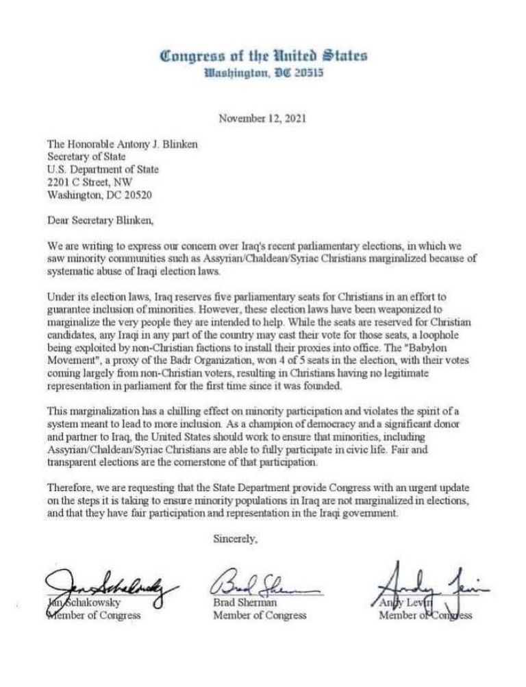 وطالب النواب وزارة الخارجية الأمريكية بـ"التدخل العاجل" لتعديل قانون "الكوتا" لضمان عدم تهميش الكلدان السريان الأشوريين، لتكون لهم مشاركة وتمثيل عادل في الحكومة العراقية.