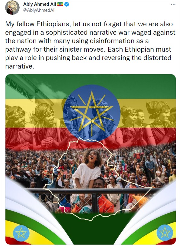 "رفاقي الإثيوبيين، دعونا لا ننسى أننا أيضًا منخرطون في حرب كلامية معقدة ضد الأمة، حيث يستخدم الكثيرون المعلومات المضللة كمسار لتحركاتهم المشئومة. يجب على كل إثيوبي أن يلعب دورًا في صد الرواية المشوهة وعكس مسارها".