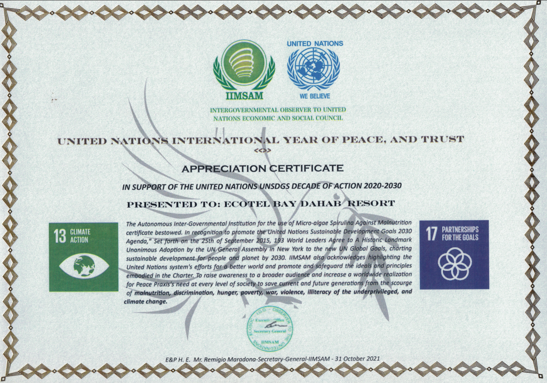 فندق ايكوتيل دهب باي فيو يحصل على شهادة الأمم المتحدة في الحفاظ على البيئة والاهتمام بالمناخ