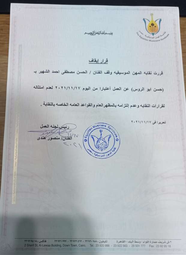واختتم كلامه تعليقًا على قرار وقفه "نقابة المهن الموسيقية على راسنا من فوق، وأي قرار على راسنا من فوق وانا راضي بيه وكل خيره وفيها تأخيره إن شاء الله".