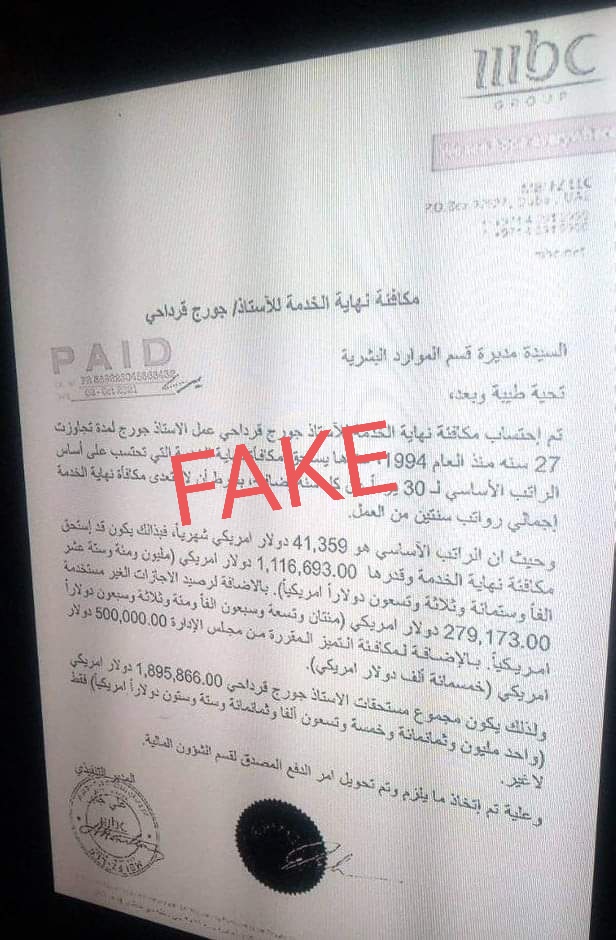 تداول نشطاء على مواقع التواصل الاجتماعي، صورة وثيقة تتضمن قيمة مكافأة ضخمة، تتجاوز المليون دولار، لنهاية خدمة وزير الإعلام اللبناني، جورج قرداحي، عندما كان يعمل بتقديم البرامج في مجموعة قنوات MBC السعودية.